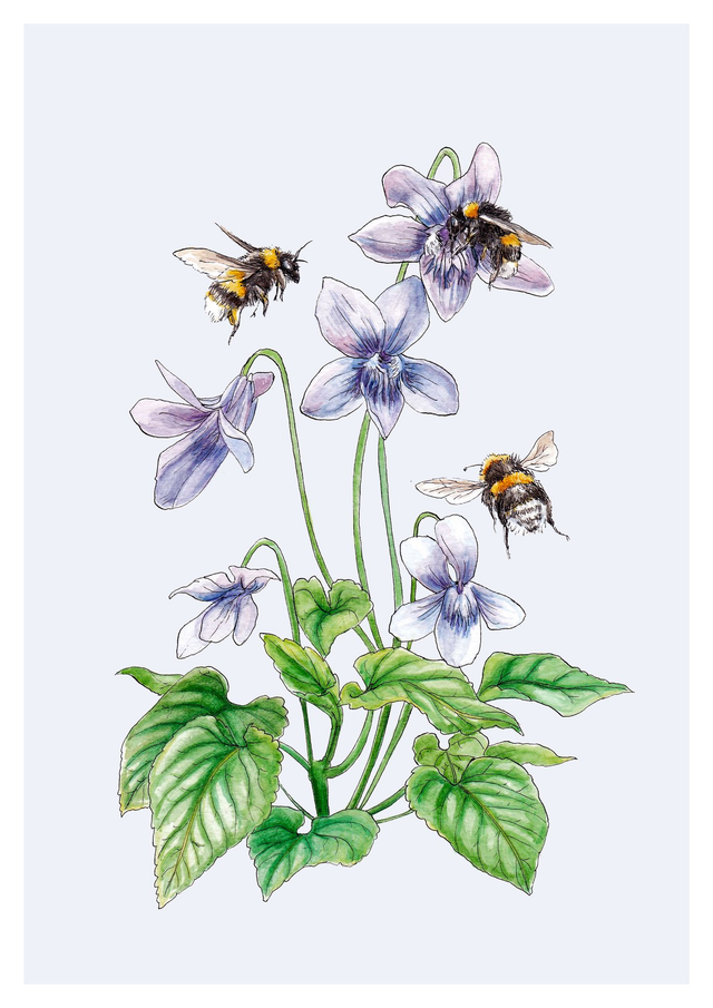 Dog Violets & Bumblebees Print - After and original ink and watercolour illustration