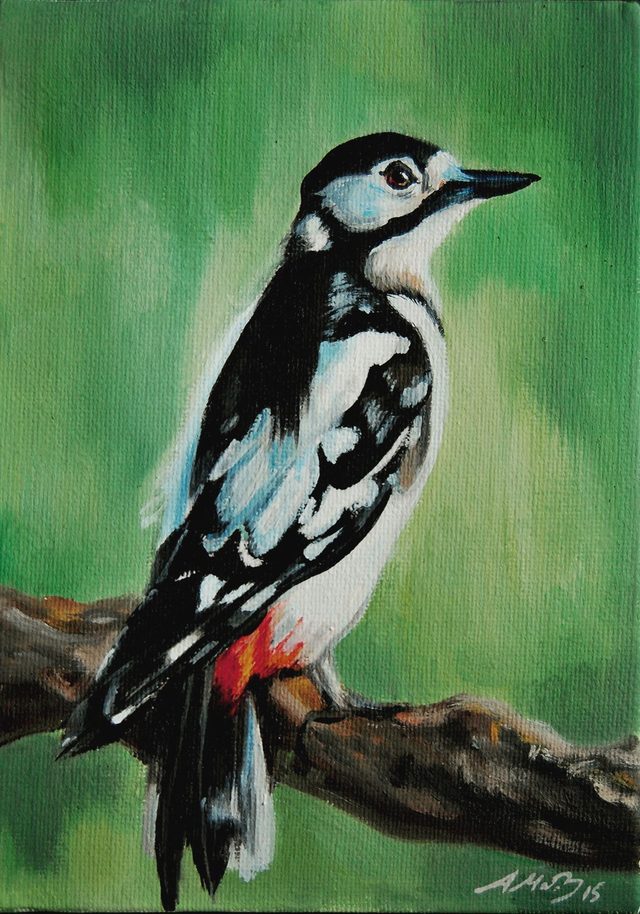 Original Oil Painting on a canvas board of a Great Spotted Woodpecker.