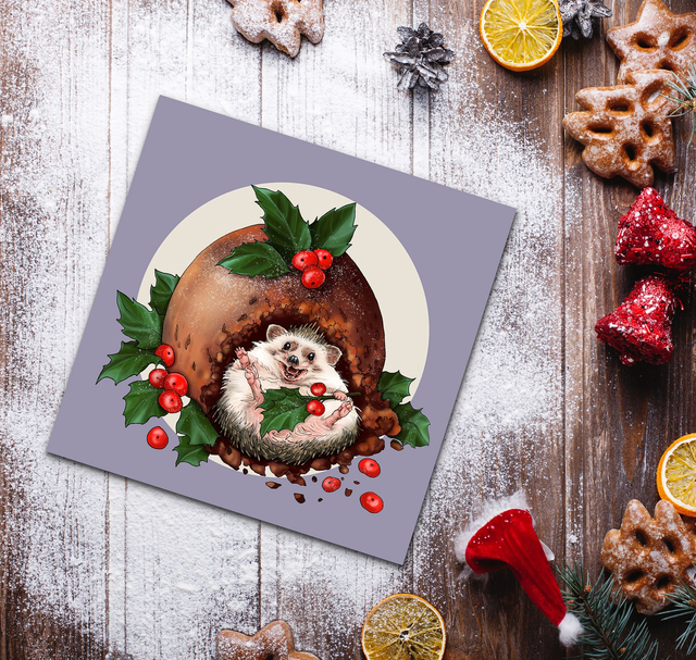 Hedgehog Christmas Card - Christmas Pudding