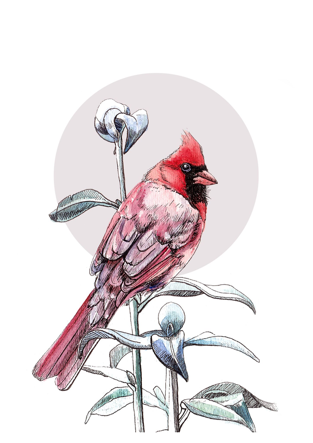 Northern Cardinal Bird Print - After an original ink and watercolour illustration