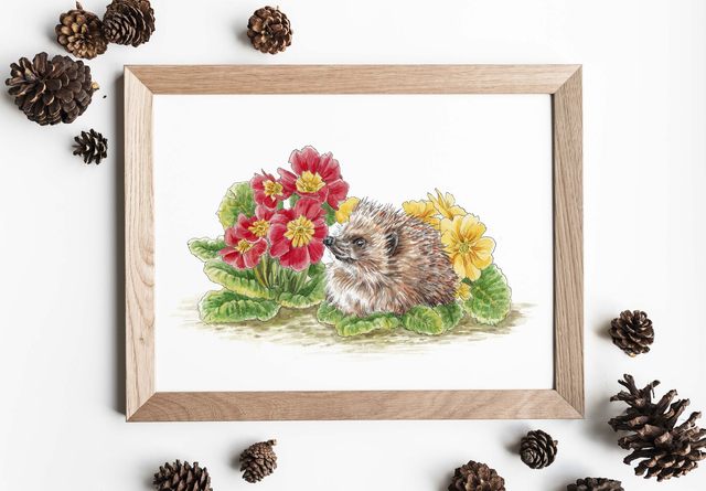 Original illustration of a Hedgehog with Primroses - Pen, Ink and Watercolour on Paper