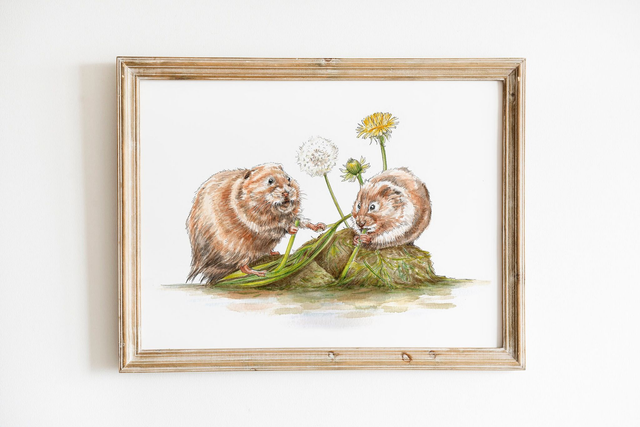 Original illustration made with pen, ink and watercolour of some cute water voles eating their favourite snack. The illustration was painted on watercolour textured paper (300gsm, acid free) and it is A4 in size.