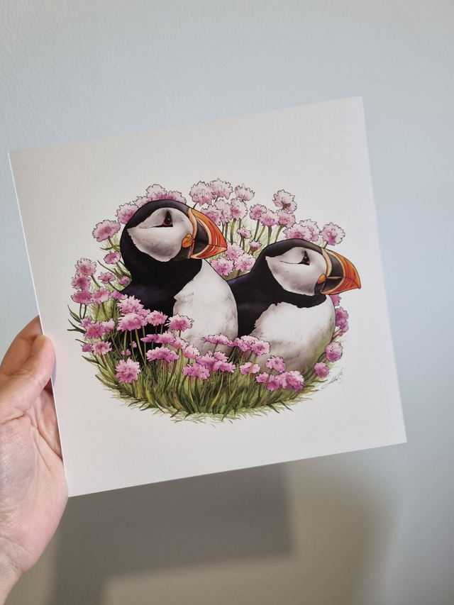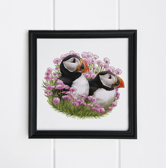Puffins and Sea Thrift - After original ink drawing with digital colouring